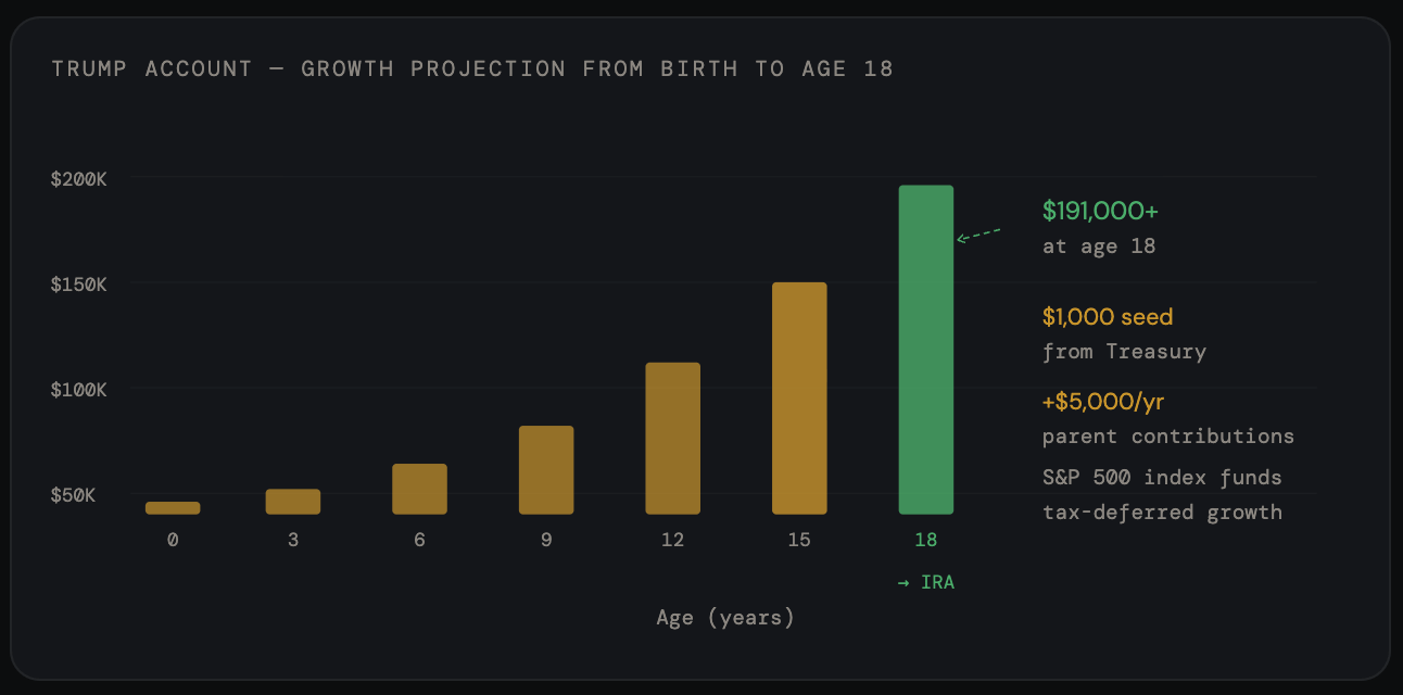 The free money: Every child born between January 1, 2025 and December 31, 2028 receives a $1,000 seed deposit from the U.S. Treasury. Over 4 million children are already enrolled.