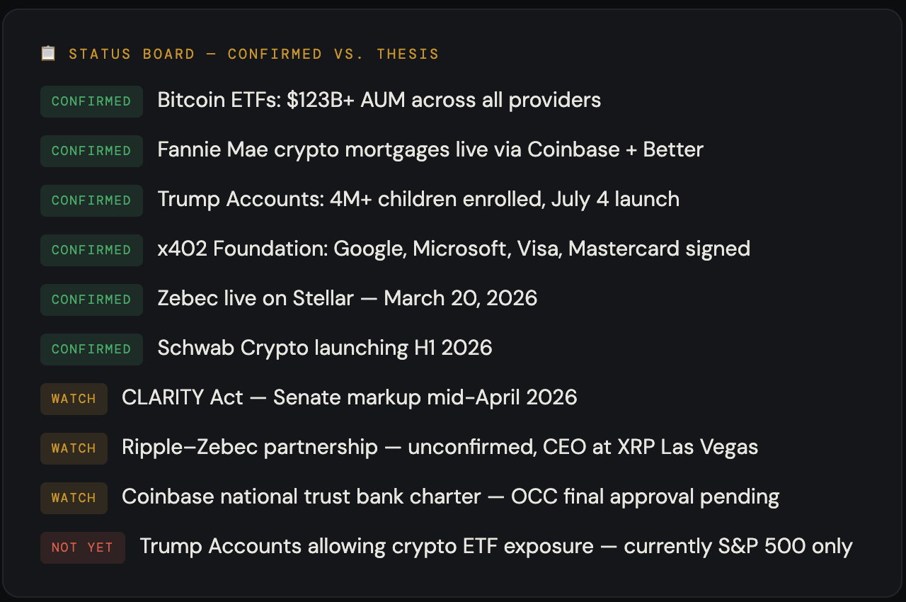 Bitcoin ETFs were approved. Then crypto mortgages via Fannie Mae. Then Trump Accounts. Then Schwab Crypto. Then x402 under the Linux Foundation with Google, Microsoft, Visa, Mastercard, and Stripe. These are not coincidences. They are not independent market developments. They are sequential steps in a coordinated institutional build-out that has been visible in the blueprint for years. The price of Bitcoin going down does not contradict this thesis. Structural demand does not require optimistic prices — it requires completed infrastructure. The infrastructure is being completed. The structural demand is being installed. The price will follow the structure, not the other way around. That is the difference between retail demand and structural demand — and it is the single most important concept in understanding where we are in this cycle.