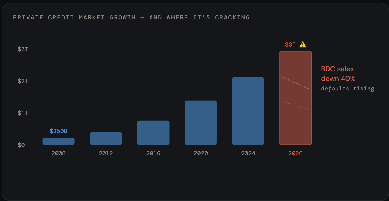 🏗️ Private Credit | A $3 trillion shadow banking system where investment funds lend directly to businesses outside the traditional banking system, with minimal transparency or regulatory oversight. |
