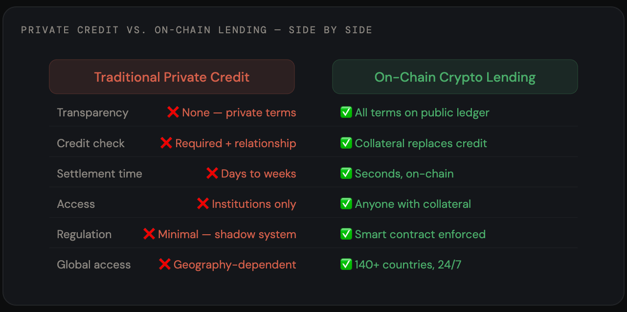 Crypto-backed lending currently requires overcollateralization — you need more crypto than you borrow. This works for individuals with digital assets. It does not yet work for a software startup that needs to borrow against future revenue. The businesses most hurt by private credit stress are those crypto lending cannot yet serve. This is an honest gap in the thesis — not a reason to dismiss it, but a reason to understand its current boundaries.