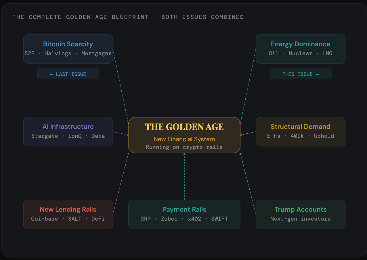 The previous issue showed how Bitcoin mining built the physical infrastructure that AI data centers now inherit. This issue explains why the energy strategy powering that infrastructure is not accidental — it is the foundational layer of the entire Golden Age thesis.