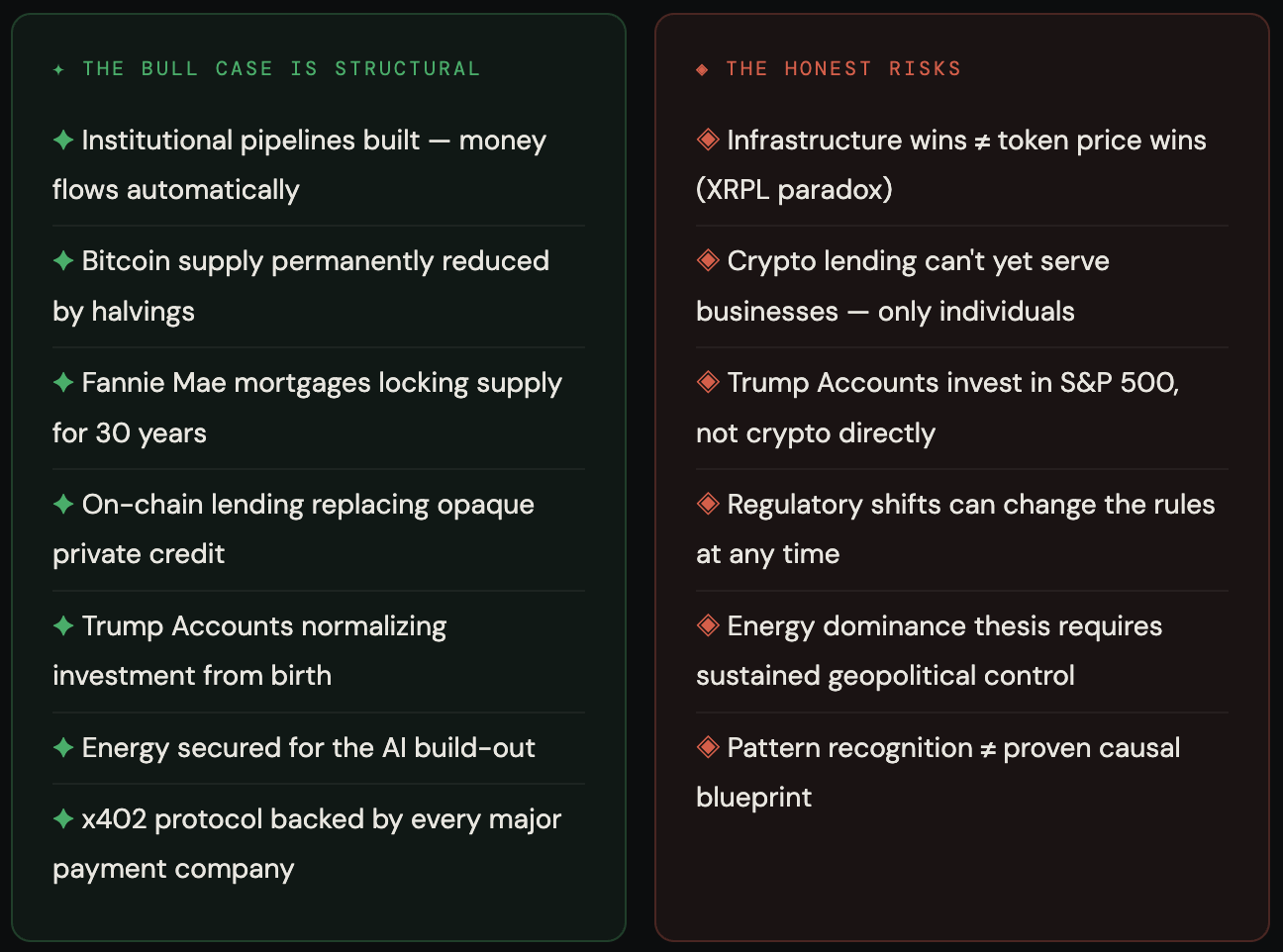 This issue fills in the demand side and the strategic architecture: structural demand replacing retail speculation, private credit cracking and crypto lending filling the gap, Trump Accounts seeding the next generation of investors, energy dominance powering the entire stack, and the institutional blueprint being executed deliberately and in sequence.