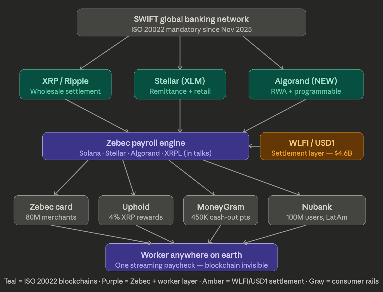 Teal = ISO 20022 blockchains · Purple = Zebec + worker layer · Amber = WLFI/USD1 settlement · Gray = consumer rails