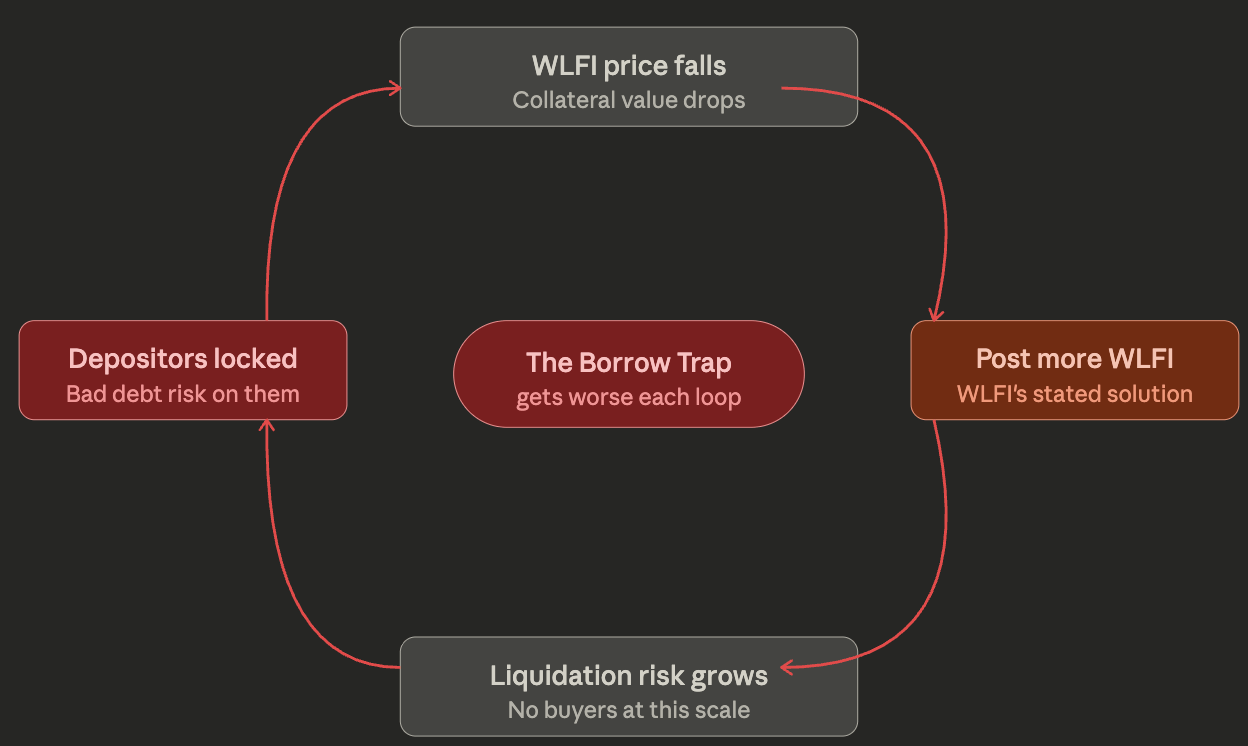 Critics point out that the plan deepens a circular risk loop: falling WLFI prices erode borrowing power, concentrate collateral in a sliding token, and worsen withdrawal constraints for existing depositors — while WLFI's treasury buybacks are now significantly underwater.