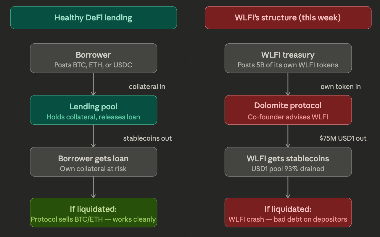 🪤 Story 2 — WLFI walked into a Borrow Trap. The same week USD1 went live on Zebec, WLFI's treasury team made a separate move that has nothing to do with payroll — and everything to do with risk. They used 5 billion of their own governance tokens as collateral to borrow $75 million in stablecoins from a DeFi lending platform whose co-founder also advises WLFI. That move drained the USD1 lending pool and left ordinary depositors unable to withdraw their funds. WLFI's token dropped 12% to an all-time low. This section teaches you exactly how this trap works — and how to spot it in any project.